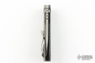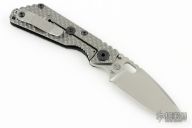 This SNG DGG by M Strider has a stonewashed blade with dual thumb studs, thumbhole, and notched thumbrest. Handle is black G-10 and bead blasted titanium "Gunner Grip", lockbar stabilizer, and titanium tip up clip. Nice detent, lockup and blade seating. New condition.
