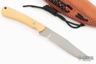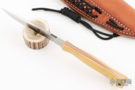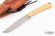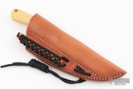 This fixed blade by Bakr-Bilt features a hand rubbed satin finish blade with .136" blade thickness and .919" blade depth, full tapered tang construction. The handle white micarta scales with aluminum pins. Comes with a brown leather sheath with ferro rod. Excellent condition. #1254