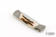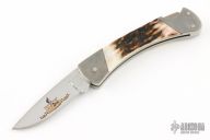 This lock back folder by Buck features a mirror polished drop point blade with nail nick. The handle has Damascus bolsters, stag inlays, stainless steel liners and backspacer. Comes with original box. Excellent condition. #429/210