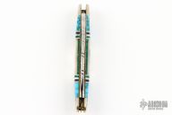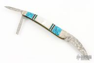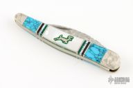 This knife was customized by David Yellowhorse. It features three "Knapped" blades with nail nicks. The handle has "Knapped" nickel silver bolsters and cap, brass liners, stainless springs, and mother of pearl/black/nickel silver/turquoise covers with a nickel silver deer. Comes with original box and papers. Excellent condition.