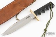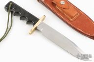 This Model 14 by Randall Made Knives features a satin finished blade with sharpened top edge, .207" blade stock. 1.400" blade depth, full tang construction. The handle has a brass guard, black linen micarta handle with a lanyard hole at the butt. This knife was designed to meet the demand for an almost indestructible all-purpose knife, though it is especially suited for combat and survival purposes. Comes with a splitback brown leather sheath. Has some light scratches and a little oxidation on the ricasso, otherwise good condition.