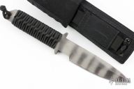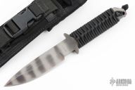 This MT Fixed Blade from Strider Knives features a tiger stripe spear point blade with false top edge and notched thumbrest, .246" blade stock and 1.271" blade depth. The handle is comprised of black paracord over full tang construction with a lanyard hole. Includes nylon sheath with belt loop. Has some scratches and patina, otherwise good condition.