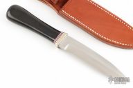This Gambler by Randall Made Knives features a satin finished blade with .206" blade stock and 1.009" blade depth, hidden tang construction. Sharpened top edge. Notched thumbrest. Black linen micarta grip with nickel silver guard, red/white/blue spacers. The Gambler is one of Randall's non-catalog knives. Comes with a brown leather sheath. Excellent condition.