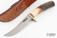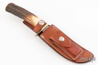 This Model 4-5 by Randall Made Knives features a satin finished blade with false top edge, .186" blade thickness and 1.066" blade depth, hidden tang construction. The handle has a brass guard and a stag grip with 7 red/white/blue spacers. Comes with a brown leather sheath. Excellent condition.