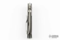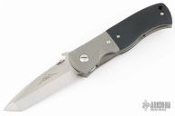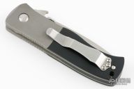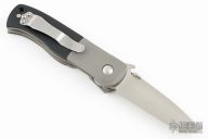 This Custom CQC-7 by Emerson Knives features a chisel ground satin finished tanto blade with notched thumbrest and a thumbdisc. The handle has bead blasted and dovetailed titanium bolsters, black paper micarta scales, bead blasted titanium liners, black G-10 backspacer, tip up stainless steel clip. Has some scuffs, otherwise excellent condition.
