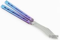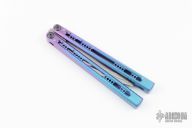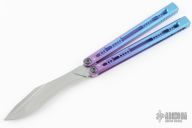 This Empusa balisong by Fellowship Blades features a milled, tumble finished bade. The handles are comprised of fade anodize finished titanium with milled full channel, bronze phosphorus washers and steel bushings. Comes with original box. Excellent condition.