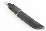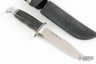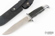 This Model 119 by Buck Knives features a satin finished clip point blade with false top edge, .177" blade stock and 1.075" blade depth, hidden tang construction. The handle has an aluminum guard and butt, and a black canvas micarta grip and spacers. Comes with original black leather sheath and box. Excellent condition.