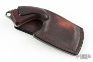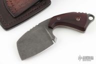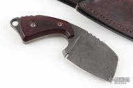 This knife by Stonewood Designs features a sheepsfoot blade with a notched thumbrest, .180" blade stock and 1.515" blade depth, full tang construction. The blade has maroon linen micarta scales with copper liners, extended tang with lanyard hole. Comes with a brown leather sheath. Excellent condition.