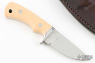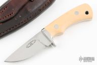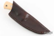 This knife by WJ McDonald features a mirror finished blade with a full tang construction, .121" blade stock and 1.024" blade depth. The handle has a nickel silver guard and ivory paper micarta scales. Includes a brown leather sheath. Excellent condition.