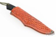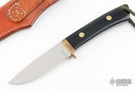 This hunter by Al Faulkner features a mirror polished blade with .176" blade stock and .991" blade depth, full tapered tang construction. The handle has a brass guard with black linen micarta scales and brass pins. Comes with a hand tooled brown leather sheath. Has a few light scratches, otherwise excellent condition.