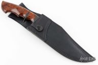 This knife by Jan Hafinec is beautiful. It features a clip point blade (C105 Carbon Steel) with amazing skull hamon, sharpened top edge, .237" blade stock and 2.250" blade depth, hidden tang construction. The handle has an antiqued bronze guard and sub-hilt, desert ironwood burl grip, single pin. Comes with a nice black leather sheath. New from maker! Stunning piece!