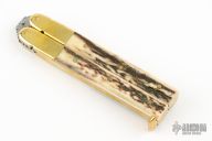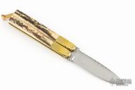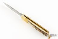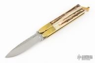 This Balisong by Nolan Knives features a mirror polished blade with fileworked spine. The handles has dovetail brass bolsters, stag scales, brass channel construction, brass T-latch. Comes with zipper case. Has some light scratches, otherwise excellent condition.