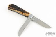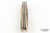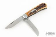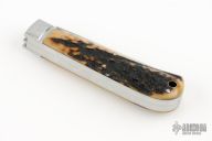 This large Remington Bullet from Mr. Ohta features two hand rub satin finished blades with nail nicks. The handle has fluted stainless bolsters, stag covers with stainless steel bullet escutcheon, stainless steel liners and springs that are flush in the closed, half-stop, and open positions. Has a few light scratches, otherwise excellent condition. Comes with a zippered case.