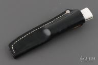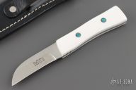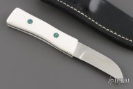 This knife by Jim DeLaRosa features a satin finished blade with notched thumbrest, .077" blade stock and .819" blade depth, full tang construction. The handle has white corian scales with brass/turquoise pins. Comes with a black leather sheath. Excellent condition.
