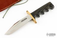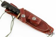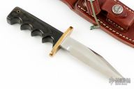 This is a miniature version of Randall's Model 14 Attack. The Model 14 was designed to meet the demand for an almost indestructible all-purpose knife, though it is especially suited for combat and survival purposes. #1304. Satin finished blade with sharpened top edge, .172" blade stock and .826" blade depth, full tang construction. The handle has a brass guard and black linen micarta grip, lanyard hole at the butt. Knife is in excellent condition. Comes with original brown leather sheath.