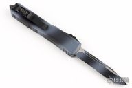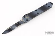 This Ultratech OTF automatic by Microtech features a S/E blade with a partially serrated edge. Stainless steel clip. Glass breaker. urban Camo aluminum handle with glass breaker. Dated 08/2017 and serial number 84083. Has some scuffs, scratches and minor wear, otherwise good condition. Comes with original box and papers.
