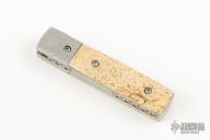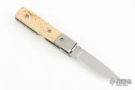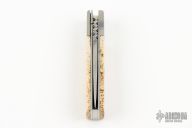This linerlock by Lonnie Williams features a mirror finished blade with nail nick and a fileworked thumbrest. The handle has jeweled titanium bolsters, walrus jawbone scales, titanium liners with jeweled interiors, fileworked stainless steel backspacer. Numbered 74 in side liner. Has some light scratches, otherwise excellent condition. Comes with COA.