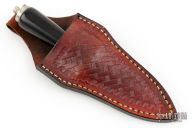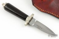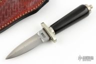 This small dagger by Todd Kopp features a hand rub satin finished double edged blade with .235" blade stock and .797" blade depth, hidden tang construction. The handle has a nickel silver guard and butt, blackwood grip. Comes with a hand tooled brown leather sheath. Has a few light scratches and patina on the blade, otherwise good condition.