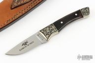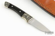 This knife by American Blade features a satin finished blade with notched thumbrest, .102" blade stock and .846" blade depth, full tang construction. The handle has engraved nickel silver bolsters, buffalo horn scales with aluminum pins. Comes with a brown leather sheath. Excellent condition.