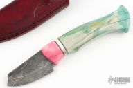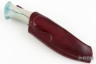This Moose Skinner by CarlMichael features a Damasteel blade made by Mig Carmichael with a hidden tang construction.  .125" Blade Stock.  1.274" Blade Depth.  The handle has a dyed and stabilized moose horn grip.  Includes a hand tooled leather sheath.  New from maker!