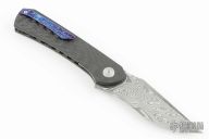 This Jax Framelock Flipper by Daniel Carraher features a polished Damasteel blade with notched thumb rest, and flipper. The handle has a carbon fiber frame, with inlaid titanium liners, and lockface insert. Mokuti backspacer, and clip. Comes with original zipper case, and COA. Has some light scratches, excellent condition otherwise.