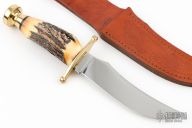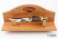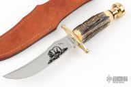 This Kodiak Bowie from Case Knives features an upswept mirror polished blade with false top edge. Kodiak Bear Etching on presentation side. The handle is comprised of brass double guard and pommel with stag handle over hidden tang construction. Includes original box, papers and hand tooled brown leather sheath with belt loop. Comes with a wooden display stand.