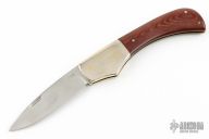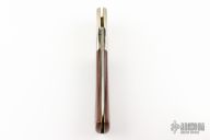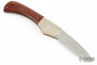 This slipjoint by Bob Ogg features a satin finished blade with nail nick. The handle has dovetailed nickel silver bolsters, burgundy linen micarta covers, brass liners, steel backspacer. Has some light scratches, otherwise good condition.