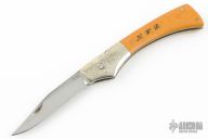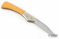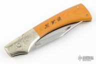 This slipjoint by Bob Ogg features a mirror finished blade with nail nick. The handle has dovetailed and engraved nickel silver bolsters, yellow paper micarta covers, nickel silver liners, steel backspacer. Scrimshawed initials on the front cover. Has some light scratches, otherwise excellent condition.