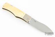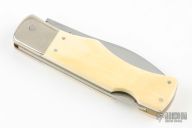 This lockback by Bob Ogg features a mirror finished blade with nail nick. The handle has dovetailed nickel silver bolsters, mammoth ivory covers, brass liners, steel backspacer. Comes with a hand tooled brown leather sheath. Has some light scratches, otherwise excellent condition. Lockback knives by Bob Ogg are very rare. It is suspected that he only made about 5 in his career.