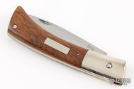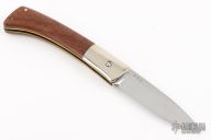 This slipjoint by Bob Ogg features a mirror finished blade with nail nick. The handle has dovetailed nickel silver bolsters, pecan wood covers, brass liners, steel backspacer. Has half-stop. Has some light scratches, otherwise excellent condition.