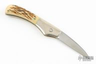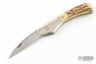 This slipjoint by Bob Ogg features a mirror finished blade with nail nick. The handle has dovetailed nickel silver bolsters, stag covers, nickel silver liners, steel backspacer. Has some light scratches, otherwise good condition.