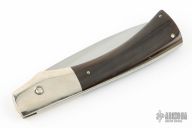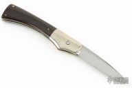 This slipjoint by Bob Ogg features a mirror finished blade with nail nick. The handle has dovetailed nickel silver bolsters, buffalo horn covers, nickel silver liners, steel backspacer. Has some light scratches, otherwise good condition. Comes with a hand tooled brown leather sheath.