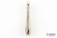 This slipjoint by Bob Ogg features a mirror finished blade with nail nick. The handle has dovetailed brass bolsters, stag covers, nickel silver liners, steel backspacer. Has some light scratches, otherwise good condition.