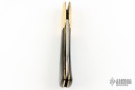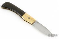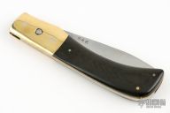 This slipjoint by Bob Ogg features a mirror finished blade with nail nick. The handle has dovetailed brass bolsters, black linen micarta covers, brass liners, steel backspacer. Has half-stop. Has some light scratches and spots on the blade, otherwise good condition.