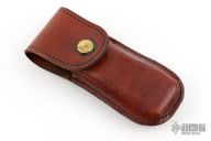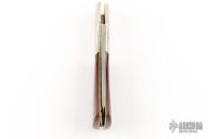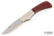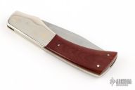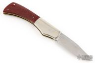 This slipjoint by Bob Ogg features a satin finished blade with nail nick. The handle has dovetailed nickel silver bolsters, red linen micarta covers, brass liners, steel backspacer. Has a brown leather sheath. Has some light scratches, otherwise good condition.
