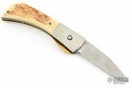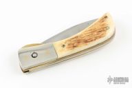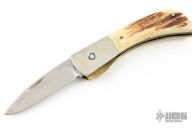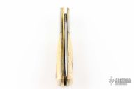 This Linerlock by Bob Ogg features a satin finished blade with nail nick. The handle has dovetailed nickel silver bolsters, stag covers, brass liners, steel backspacer. Has a brass locking liner. Has some light scratches and a couple spots on the blade, otherwise good condition.