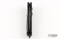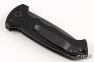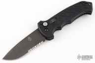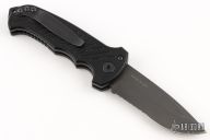 This 06 Side Opening Auto has a matte black finished S30V drop point blade with partial serrations. The handle is black aluminum over black stainless steel liners, exposed stainless steel tang butt/ glass breaker/ backspacer with lanyard hole, black stainless steel tip up (RH/LH reversible) clip, and safety button. Comes with original belt sheath. Has some light scuffs, otherwise Excellent condition.