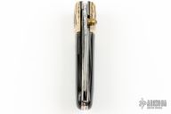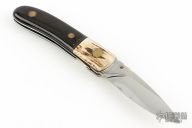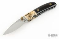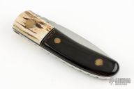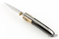 This linerlock by "F.B." (please let us know if you know who this is) features a mirror polished blade with fileworked spine, brass thumbstud. The handle has stag bolsters, buffalo horn scales, stainless steel liners and fileworked backspacer. Has some light scratches and patina, otherwise good condition.