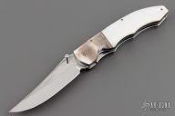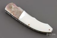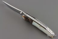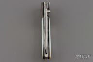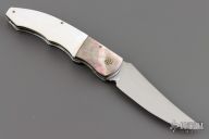 This linerlock by John Thita features a mirror polished blade with single thumb stud and notched thumbrest. The handle has black lip pearl bolsters, mother of pearl scales, stainless steel liners and fileworked backspacer. Has some light scratches, otherwise excellent condition.