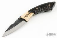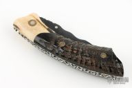 This linerlock by John Thita features a mirror polished blade with black flats, single thumb stud and fileworked spine. The handle has stag bolsters, moutain goat scales, fileworked stainless steel liners and backspacer. Has some light scratches, otherwise excellent condition.