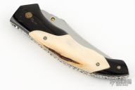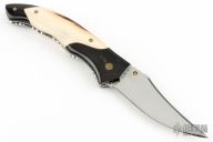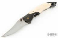 This linerlock by John Thita features a mirror polished blade with single thumb stud with red stone inlay and a fileworked spine. The handle has buffalo horn bolsters, stag scales, fileworked stainless steel liners and backspacer. Has some light scratches, otherwise excellent condition.