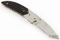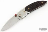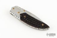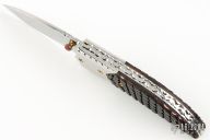This linerlock by John Thita features a mirror polished blade with single thumb stud with red inlay and a fileworked spine. The handle has fileworked stainless steel bolsters, komodo dragon skin scales, fileworked stainless steel liners and backspacer. Has some light scratches, otherwise excellent condition.
