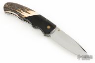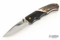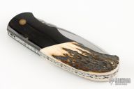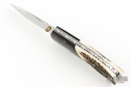 This linerlock by John Thita features a mirror polished blade with single thumb stud and a fileworked spine. The handle has buffalo horn bolsters, stagscales, fileworked stainless steel liners and backspacer. Has some light scratches, otherwise excellent condition.