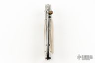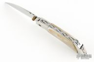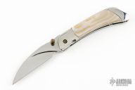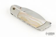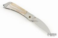 This linerlock by John Thita features a mirror finished blade with a single thumb stud and a fileworked spine. The handle has stainless steel bolsters, mother of pearl scales, fileworked stainless steel liners and backspacer. Has some light scratches, otherwise excellent condition.