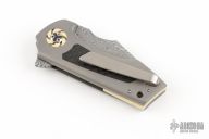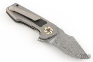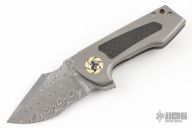 This Micro Boson flipper from Michael Burch features a Damasteel blade with notched thumbrest and flipper. The handle has a bead blast finished titanium frame with carbon fiber inlays, orange peel finished tip up titanium clip with hidden screws, ivory paper micarta pivot collars and backspacer. Nice detent, lockup and blade seating, rides on bearings. Comes with a cloth case and COA dated NCKS '22. Excellent condition.