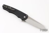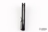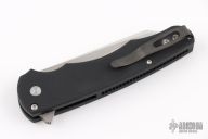 This prototype flipper model features black anodized handle scales, a reverse tanto style blade in a mirror polish finish and the pocket clip is designed for tip up carry only.
