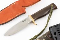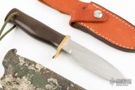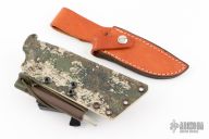 The Model 28 by Randall Made Knives is an excellent skinning and outdoors knife. Has a satin finished drop point blade with false top edge and notched thumbrest, stainless steel blade, .159" blade stock and 1.187" blade depth, full tang construction. The handle has a brass guard, green linen micarta handle and a lanyard hole at the butt. Comes with a custom brown leather sheath and a custom Kydex sheath with TekLok and sharpening steel. Has some light scratches, otherwise excellent condition.