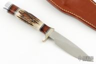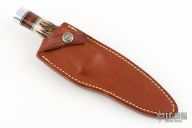 This Model 26 Pathfinder by Randall Made Knives is one of Randall's best-selling models. It features a drop point satin finished blade with .172" blade stock and .876" blade depth, hidden tang construction. The handle has a nickel silver guard and duralumin butt, stag grip and black/duralumin/leather spacers. Comes with a brown leather sheath. Excellent condition.