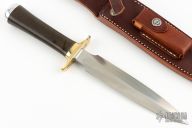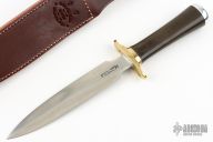 This Model 2-7 by Randall Made knives features a satin finished double edged blade, .200" blade thickness and 1.208" blade depth, hidden tang construction. The Model 2 is a heavily made dagger or dirk. Has a brass double guard and rounded duralumin butt, green linen micarta grip with black spacers. Comes with a brown leather sheath. Excellent condition.