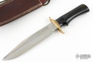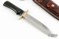 This Model 14 CDT by Randall Made Knives features a clip point satin finished blade with sharpened top edge, .193" blade stock and 1.386" blade depth, hidden/cut down tang construction. The handle has a brass double guard, single finger groove black linen micarta grip with red/white/blue spacers and a lanyard hole at the butt. This knife was designed to meet the demand for an almost indestructible all-purpose knife, though it is especially suited for combat and survival purposes. Comes with a brown leather sheath. Excellent condition. The back of the blade reads "SEND ME". This knife came from someone on the CIA Ground Branch, when the Randall shop was asked about this, they said "Oh, I remember that one!"